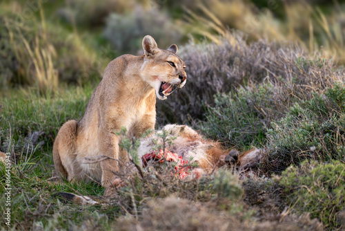 Puma sits opening mouth beside guanaco carcase