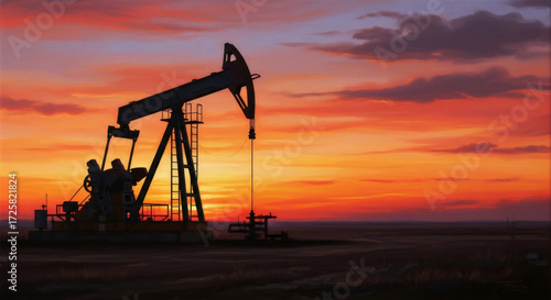 Pumpjack extracting oil at sunset. Energy industry production. Resource extraction and fossil fuel supply.