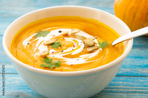 soup, pumpkin, vegetable, food, yellow, blue, bowl, dinner, healthy, tasty, vegetarian, cream, hot, meal, orange, rustic, background, closeup, delicious, diet, epicure, lunch, top, creamy, autumn, cookery, halloween, plate, traditional, fresh, wooden, view, eating, mashed, napkin, space, spicey, thanksgiving, vegan, cooking, dish, indian, squash, american, bread, butternut, clean, crushed