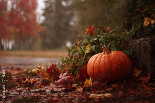 Pumpkin sits among colorful autumn leaves on rainy day, creating cozy fall atmosphere