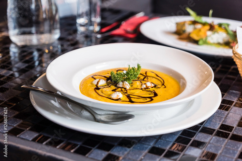 american, autumn, bowl, bread, butternut, clean, cream, creamy, crushed, cookery, curry, delicious, diet, dinner, eating, food, epicure, halloween, healthy, herbal, hot, lunch, macro, mashed, meal, orange, plate, pumpkin, rustic, smooth, soup, space, spicey, squash, tasty, thanksgiving, traditional, turmeric, vegan, vegetable, vegetarian, yellow
