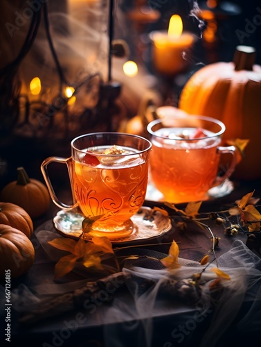 Pumpkin spice cup of tea stock photo, cozy teatime autumn drink