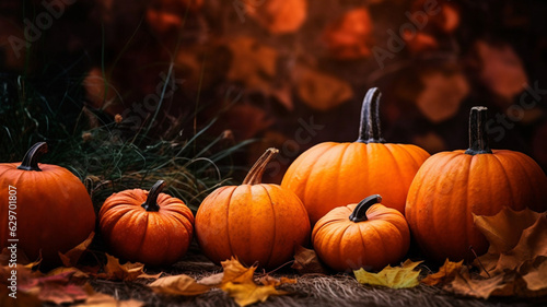 Pumpkins and fallen leaves. Autumn background. AI generated
