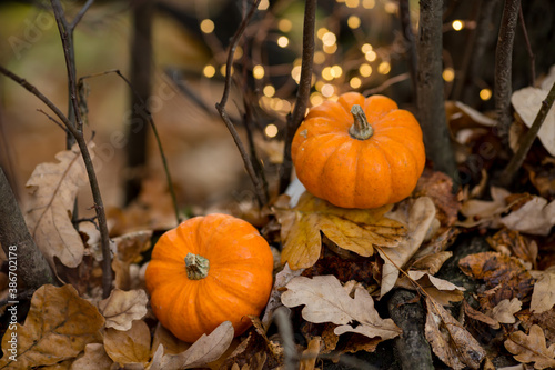 pumpkins in nature in fallen leaves, lights from garlands, bokeh. Autumn background