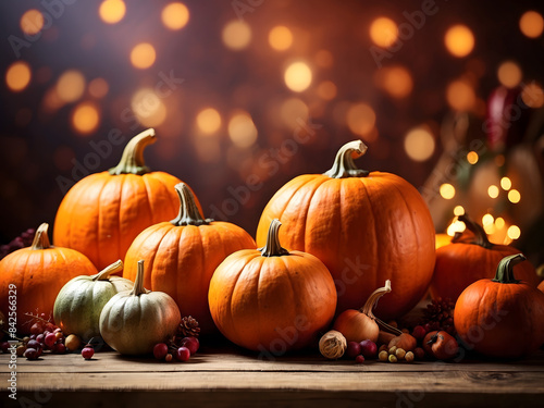Pumpkins On Wooden Table - Thanksgiving Background With Vegetables And Bokeh Lights design