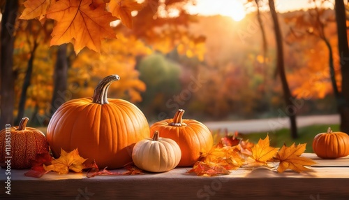 Pumpkins Surrounded by Vibrant Autumn Maple Leaves on a Rustic Wooden Table with Golden Sunlight and Blurred Background. Perfect Thanksgiving Concept with Warm Seasonal Atmosphere and Copy Space