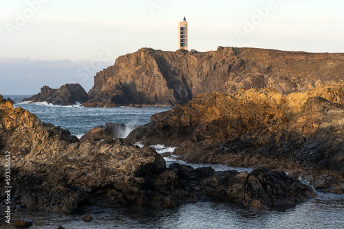 Punta Frouxeira lighthouse with the cliffs in the Rias Altas touristic area of Galicia at sunset, Valdoviño, Meiras, Spain.