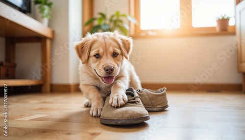 puppy, shoe, living room, play, indoor, sunlight, domestic, pet, animal, happy, playful, furniture, hardwood floor, home, cute, canino, young, companionship, energy, joy, fun, interaction, affection, floor, presence, happiness, love, smiling, curiosity, relaxation, indoor, lifestyle, friendly, small dog, adventure, domestic life, cosy, exploration, warmth, comfort, innocence