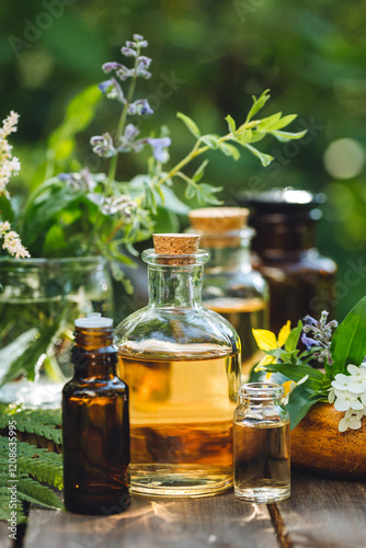 Pure natural ingredients for cosmetic production. Concept of alternative herbal medicine. Bottles of tincture or potion, organic essential oils, dry healthy herbs, floral extracts on wooden table.