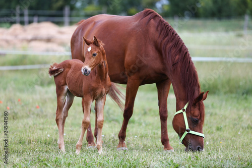 Purebred mare and her few weeks old filly graze in summer flowering pasture idyllic picture