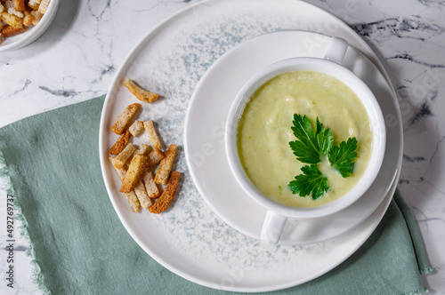 food, dish, soup, green, spring, summer, autumn, fresh, breakfast, dinner, lunch, ingredient, onion, broccoli, potato, cream, crouton, vitamin, tasty, healthy, beautiful, serving, easy, epicure, closeup, natural, menu, delicious, health, fast, from above, kitchen
