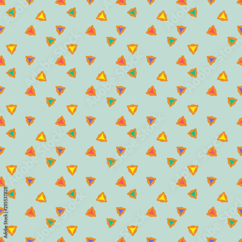Purim seamless pattern with hamantaschen cookies in cartoon style. Textile ornament with hamantaschen cookies on light background. Design for the decoration of the Jewish holiday of Purim.