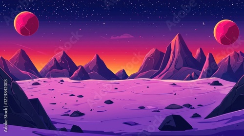 purple, alien, landscape, mountain, range, 2, moon, sky, star, night, sunset, pink, orange, yellow, dark, blue, foreground, background, horizon, rocky, terrain, crater, desert, fantasy, illustration, digital, art, abstract, futuristic, space, outer, cosmos, celestial