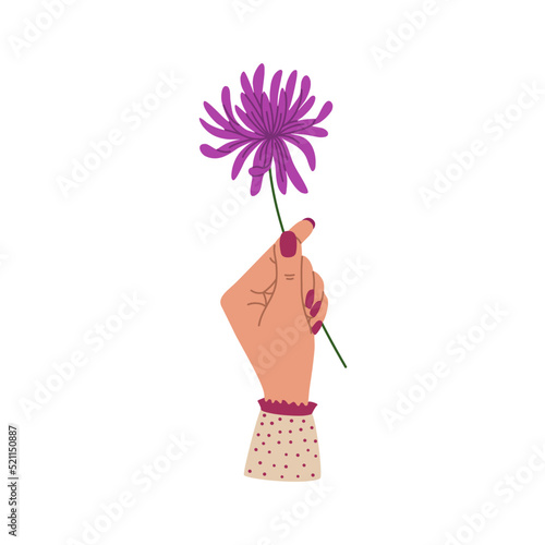 Purple aster flower in female hand. Blooming beautiful spring plant. Hand drawn vector illustration isolated on white background. Modern flat cartoon style.