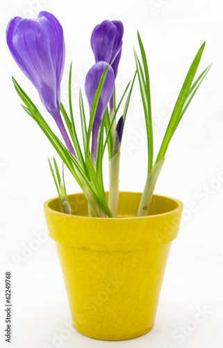 Purple crocus in yellow pot isolated on white background