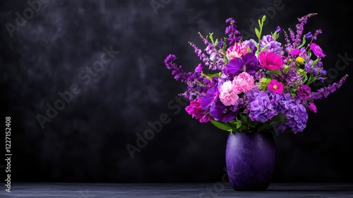 Purple flower bouquet in vase, dark background, floral arrangement, greeting card design