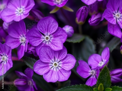 Purple flower petals and leaves in a vibrant and striking composition, bloom, detail