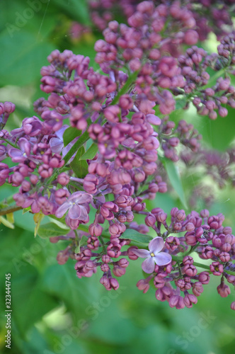 Purple flowers in the garden. Blurry bunch of pink lilac flowers closeup with bokeh background of green foliage. Purple blossoms and flower buds of lilac bush in garden at springtime. Defocused floral
