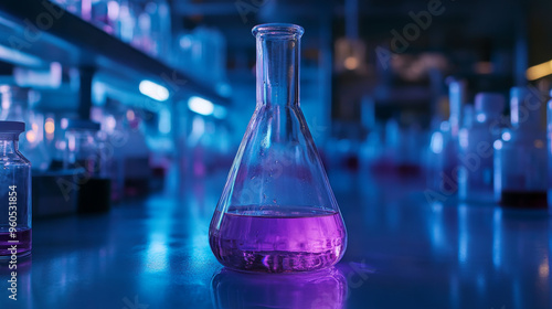 Purple glass flask in a blue chemistry lab, a research science banner.