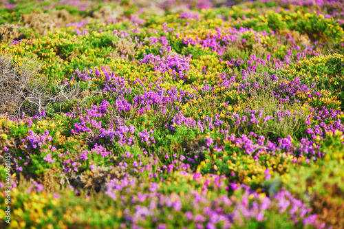 Purple heather meadows on Cape d'Erquy, Brittany, France