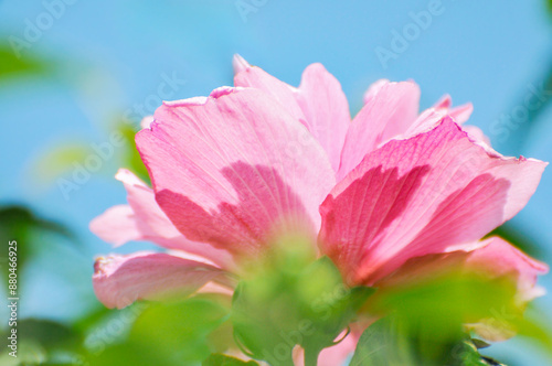 purple hibiscus flowers bloom on a green branch in the summer garden.