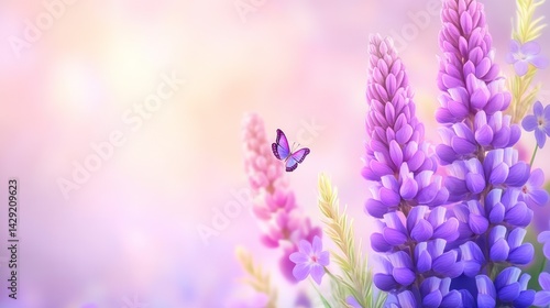 Purple Lupines and Butterfly in a Soft Spring Meadow