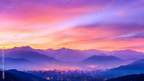 Purple Mountains at Dusk A city glows in the valley below, perfect for travel ads, articles, or atmospheric backgrounds
