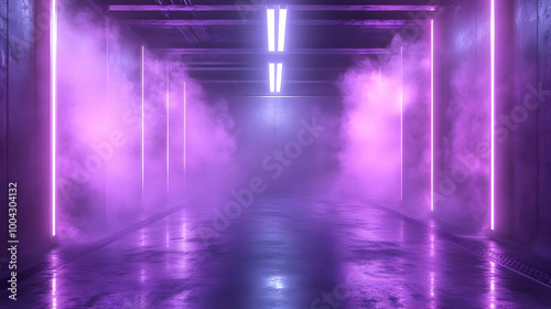 Purple Neon Lights in a Foggy Tunnel 3D Illustration