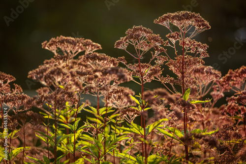 Purple Plantt - A pink-flowering garden plant that is photographed against the light. Autumn flowering perennial.