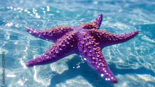Purple spiny starfish in the water. Sea life, bright exotic creatures.