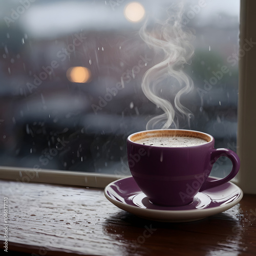 Purple Steaming Coffee Cup on Saucer by Rainy Window - Cozy Indoor Scene with Raindrops on Glass