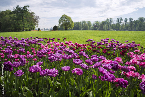 purple tulips on the flower bed