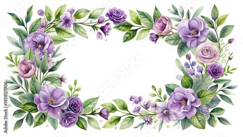 Purple Watercolor Floral Frame, Delicate Rectangular Flower Frame, Soft Violet Flowers, Green Leaves, White Background, Botanical Frame, Floral Border, Wedding Invitation Frame