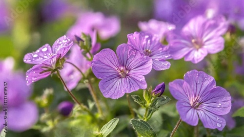 Purple wildflowers with dew drops on petals in a natural setting focused on floral details Copy Space