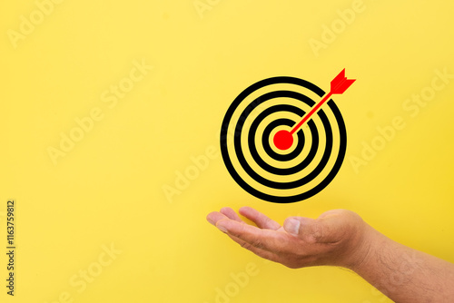 Purpose and goal concept.,Hand holding dartboard targets icon with copyspace., strategic focus, and success planning for efficient goal achievement and motivational success.