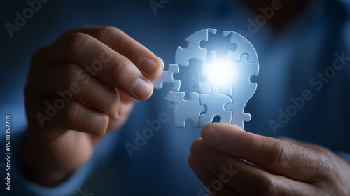 Puzzle piece light bulb fitting into detailed head jigsaw concept