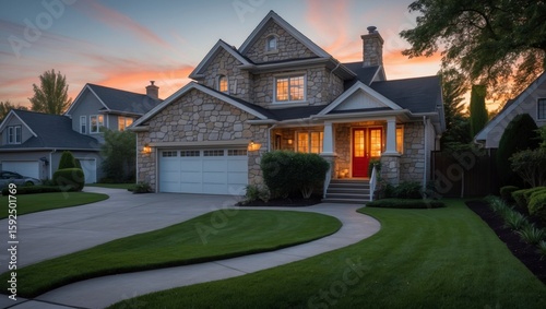 neighbourhood, residence, real estate, driveway, landscaped, property, dwelling, residential, peaceful, tranquil, quiet, dusk, luxury, roomy, idylli, upscale, lawn, quaint, welcoming, family, refined, home, evening, paseo, charming, exterior, modern, house, nobody, design, grass, facades, building, architecture, traditional, landscape, stone, front yard, high fidelity