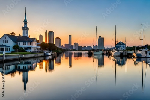 Quaint summer scene of a sailboat and white cape cod style homes and buildings
