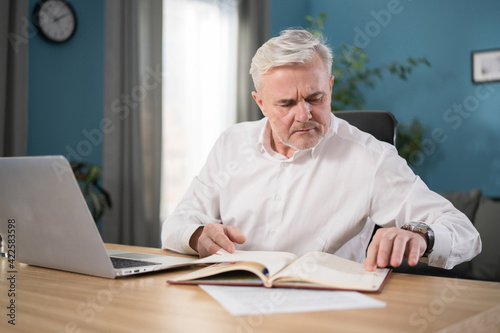 Qualified serious male businessman doing online research, reading news, making notes in financial journal. Focused old middle aged man using laptop writes down important information sits at office