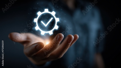 quality assurance concept with glowing check mark inside gear icon floating above open hand in dark background