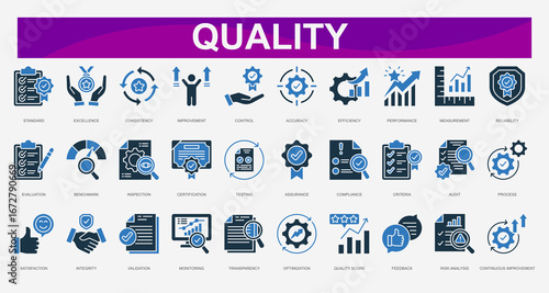 Quality color Icons set. Vector illustration.Standard, Excellence, Consistency, Improvement, Control, Accuracy, Efficiency, Performance, Measurement, Reliability. Vector illustration