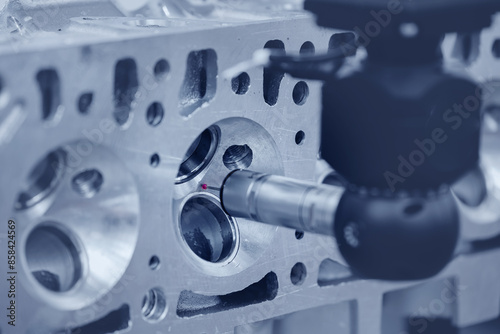 Quality control of drilling CMM in car engine. Milling CNC machinery with coordinate measuring machine for automotive parts industrial