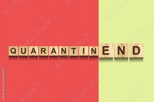 Quarantine End. The inscription on wooden blocks on a red-green pastel background. The end of the pandemic.