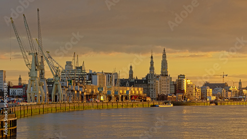 Quays of river Scheldt in Antwerp, with historical buildings, skyscrapers and cruise ship in hazy sunset light