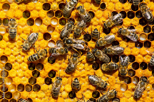 mistress, insect, bee, honey bee, fauna, animal, reproduction, egg, life, new life, instinct, entomology, science, movement, teamwork, coordination, communication, care, beauty, stimulation, apiculture, honeycomb, macro, colony, uniqueness, originality, image