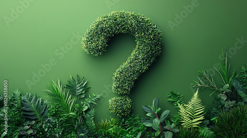 question mark symbol covered in lush green plants, symbolizing growth, curiosity, and the mysteries of nature. Represents the unknown, exploration, and the power of environmental inquiry