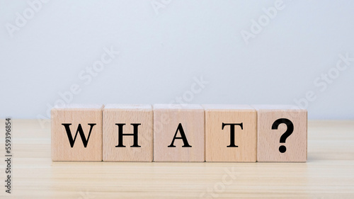 Question "what" word with black wooden cube on wooden table background. Frequently Asked Questions and Answer Ideas
