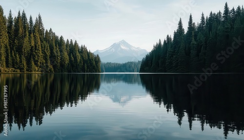 Quiet lake surrounded by dense forest, glassy water reflecting the trees and sky, distant mountains in the background, low-angle, soft light, tranquil and serene landscape