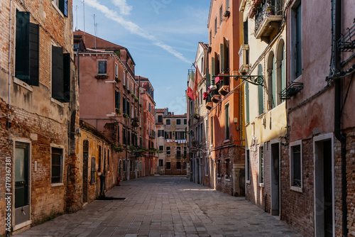 Quiet street in Venice with old brick houses, colorful walls and hanging flowerpots creating authentic charm of Italian old town lifestyle and atmospheric pedestrian perspective