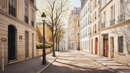 quiet street with empty avenues bathed in muted light, featuring cobblestone pavement, classic European architecture, and soft shadows from trees lining path